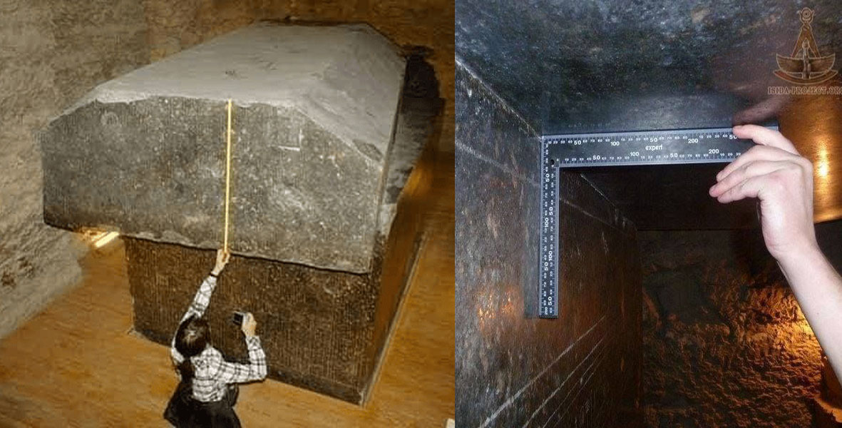 O milagre é que todos os cantos internos e externos dos sarcófagos formam ângulos perfeitos de 90 graus, e não 90,1 ou 89,9, e o coeficiente de planicidade tem uma taxa de erro inferior a 0,02%, um nível que só pode ser alcançado na era moderna com máquinas de alta precisão ou tecnologia óptica, como o laser, para obter uma planicidade perfeita. E o próprio sarcófago é polido a tal ponto que nos faz questionar se máquinas ou tecnologias avançadas poderiam tê-lo escavado e polido com tamanha precisão.