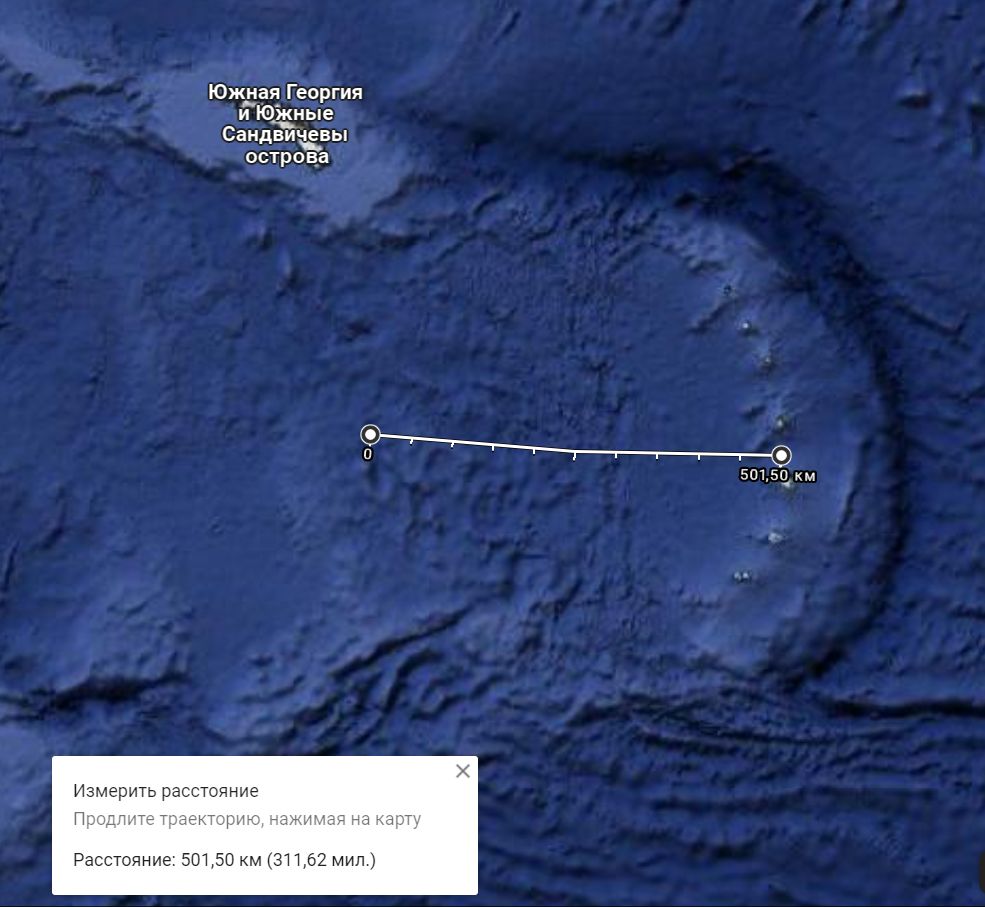 Essa imagem mostra a Passagem de Drake, que fica entre o extremo da América do Sul (Cabo Horn, no Chile) à Península Antártica (Ilhas Shetland do Sul). A passagem tem aproximadamente, 800 a 1.000 quilômetros de largura (ou comprimento do trecho a ser navegado). Dá para ver que algo grande, como um asteroide, colidiu exatamente neste local, distanciando os dois continentes.
