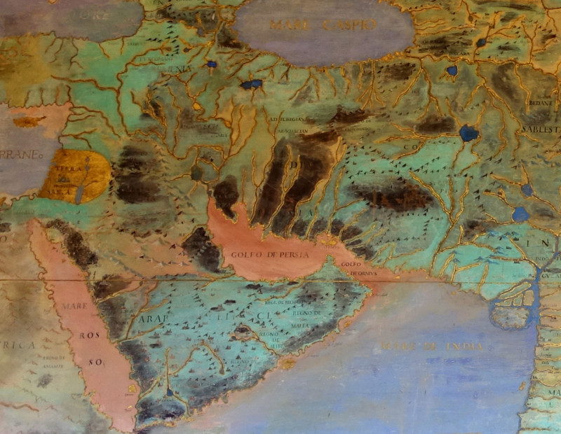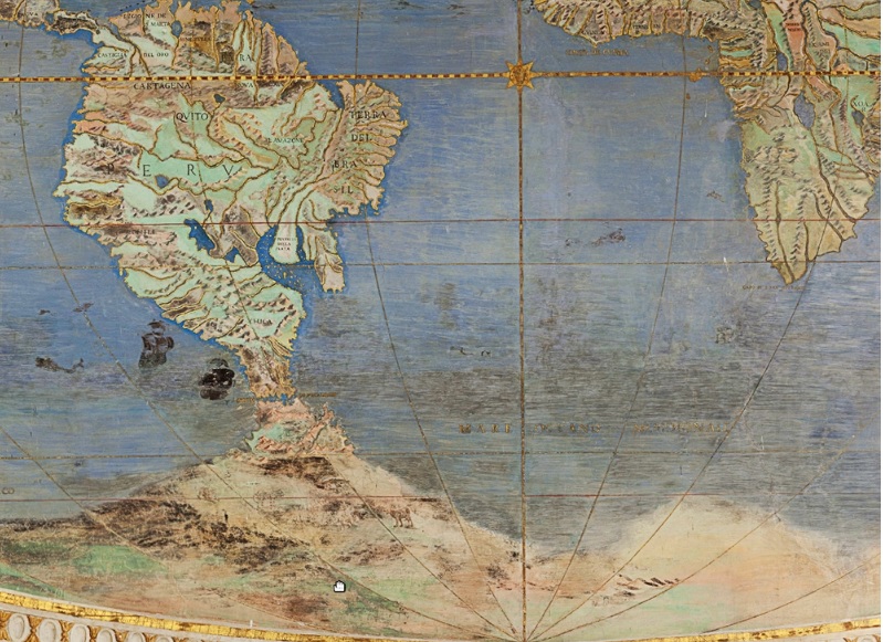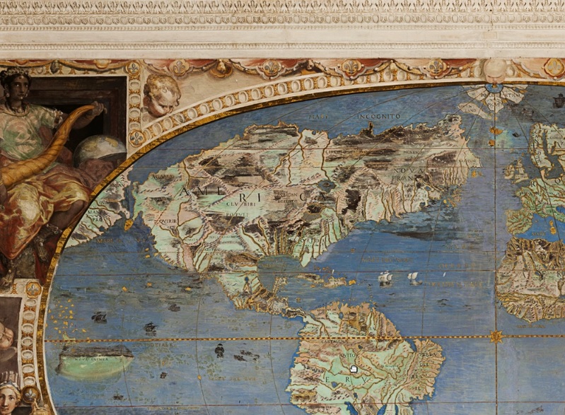 Mapa-múndi da América do Norte e do Sul, obra do artista Giovanni Antonio da Varese, na parede da Villa Farnese.