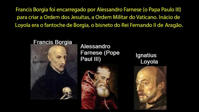 A Ordem dos Jesuítas foi financiada pela família Borgia, da Nobreza Papal, como um meio de minar, ou esmagar, qualquer desafio ao domínio do Papado. Inácio de Loyola e seus soldados jesuítas Illuminati foram considerados intocáveis a partir desse ponto e se tornaram a milícia das famílias aristocratas que controlam a Nova Ordem Mundial do Vaticano e City de Londres.