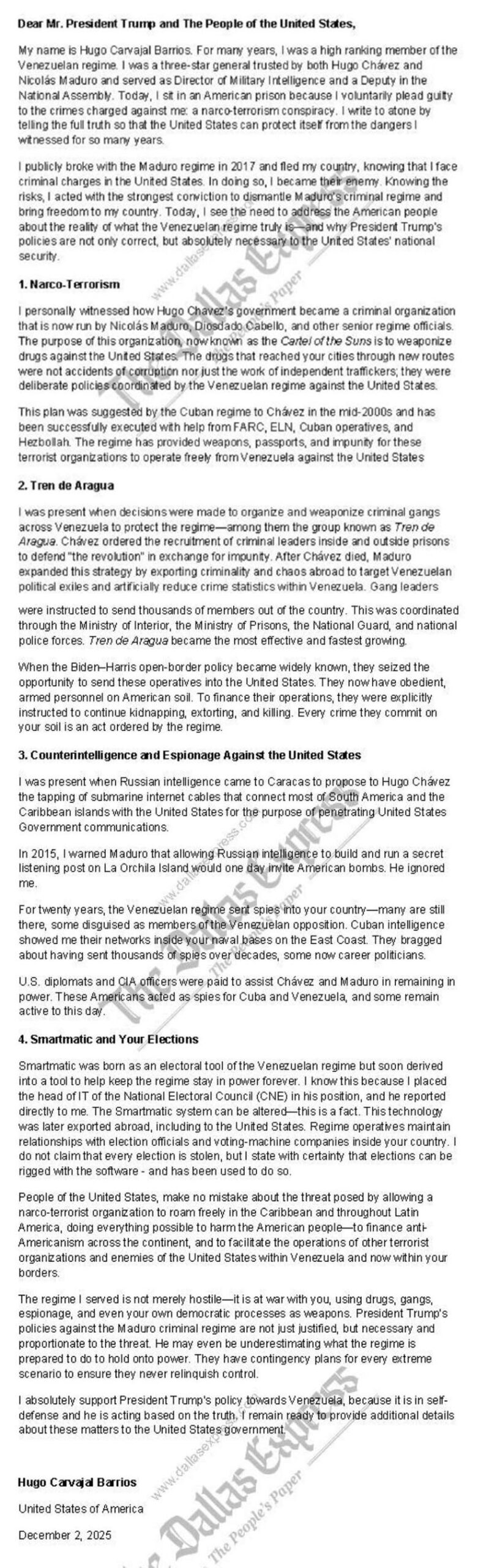 Carta desclassificada escrita ao Presidente Trump pelo ex-Diretor de Inteligência Militar do regime Maduro. Confirmando: