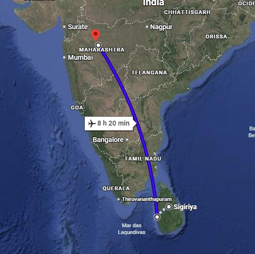 Essa mapa mostra a distância de avião entre o Templo de Kailasa na Índia e a rocha de Sigiriya, no Sri Lanka. Numa nave antigravidade, a distância é percorrida em 2 minutos ou menos.