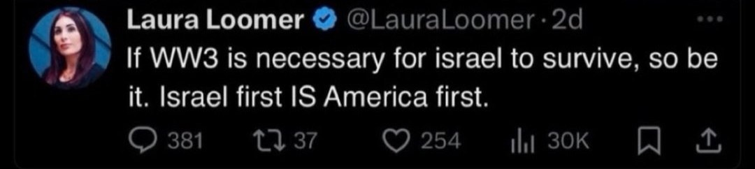 “Se a Terceira Guerra Mundial for necessária para a sobrevivência de Israel, que assim seja. Israel em primeiro lugar É a América em primeiro lugar.” – Laura Loomer