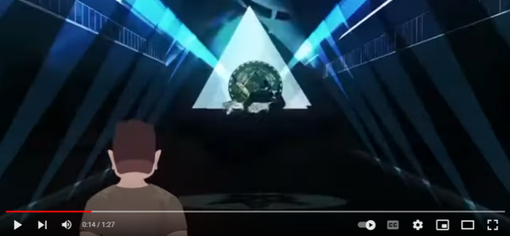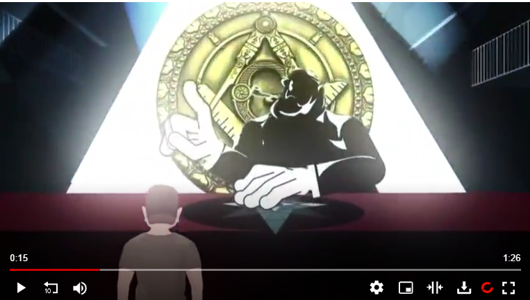 Quando Zelensky está chegando no fundo da sala, aparece uma pirâmide com um logotipo maçônico proeminente, e o chefe Illuminati está sentado em uma cadeira aguardando seu fantoche.