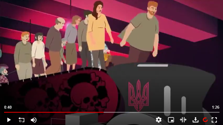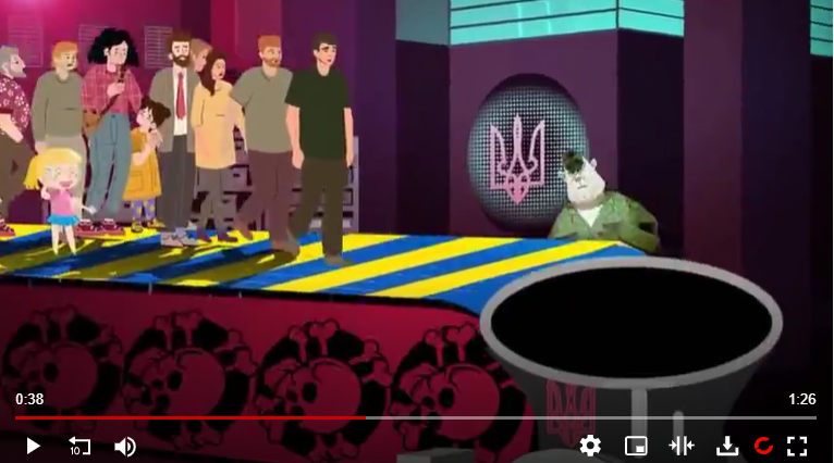 “Ukraine Cocaine” é uma animação francesa que retrata o “grande herói de guerra” Zelensky como um fantoche bêbado, cheirando cocaína (que rima com Ucrânia), alimentando os ucranianos num moedor de carne, usando bandidos nazistas para recrutar à força mais ucranianos para o moedor de carne e enchendo sua mala com maços de dólares americanos. O cartoon é rico em detalhes, por exemplo, a pintura cubista do herói nazista Stepan Bandera no escritório de Zelensky.