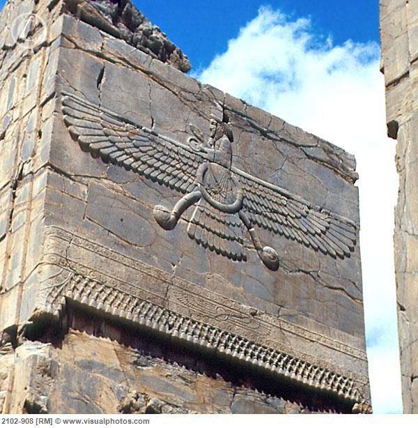 Essa imagem mostra o Faravahar, um dos símbolos mais conhecidos do zoroastrismo, uma das religiões monoteístas mais antigas do mundo. O zoroastrismo sofreu influência do atonismo de Akhenaton. A divindade suprema é Ahura Mazda, o “Senhor da Sabedoria”, que é o criador do universo e a personificação do bem. O deus Ahura Mazda, sempre representado com barba, está dentro de um disco com asas, o que significa que ele pode voar como um pássaro.