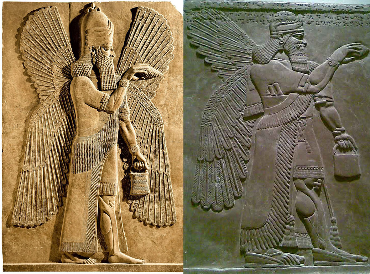 Os deuses da Mesopotâmia incluem os Anunnaki, um grupo de divindades frequentemente representadas como humanos barbudos com asas de pássaros usando gorros com chifres e segurando uma bolsa. Anunnaki significa “aqueles que descem do céu”. As asas significam que eles podem voar e as bolsas que carregam em uma das mãos contem sementes para agricultura.