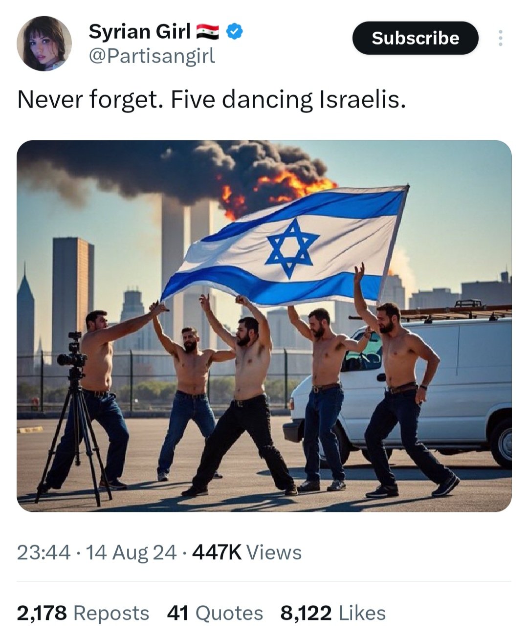 Pelo menos uma testemunha ocular entrevistada pelo FBI viu a van dos israelenses no estacionamento por volta das 8h da manhã daquele dia, mais de 40 minutos antes do ataque. A história foi noticiada pela mídia americana na época, mas desde então foi amplamente esquecida. Eles ficaram conhecidos como os cinco “israelenses dançantes” do 11/9.