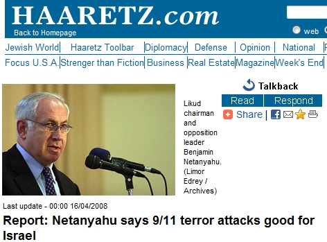 O jornal israelense Ma’ariv relatou que o líder do partido Likud, Benjamin Netanyahu, disse numa audiência no Bar Ilan: “Estamos nos beneficiando de uma coisa: o ataque às Torres Gêmeas e ao Pentágono, e a luta americana no Iraque”, disse o Ma’ariv, citando Netanyahu. Ele teria acrescentado que esses eventos “balançaram a opinião pública americana a nosso favor”. É claro que a indiferença de Netanyahu em fazer publicamente declarações tão debochadas não é surpreendente, considerando quanto controle os judeus sionistas têm sobre a mídia americana.
