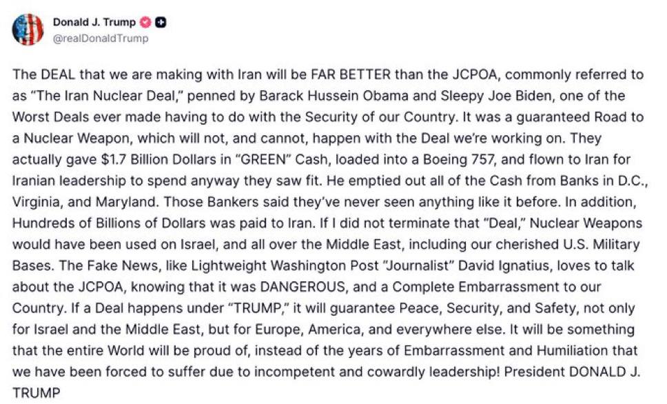 “O ACORDO que estamos fazendo com o Irã será MUITO MELHOR do que o JCPOA, comumente chamado de “Acordo Nuclear com o Irã”, redigido por Barack Hussein Obama e Joe Biden, um dos piores acordos já feitos em relação à segurança do nosso país. Era um caminho garantido para uma arma nuclear, o que não acontecerá, e não pode acontecer, com o acordo em que estamos trabalhando. Eles realmente deram US$ 1,7 bilhão em dinheiro vivo, carregado em um Boeing 757 e enviado ao Irã para que a liderança iraniana gastasse como bem entendesse. Ele esvaziou todo o dinheiro dos bancos em Washington, Virgínia e Maryland. Esses banqueiros disseram que nunca viram nada parecido antes. Além disso, centenas de bilhões de dólares foram pagos ao Irã. Se eu não tivesse rescindido esse “acordo”, armas nucleares teriam sido usadas em Israel e em todo o Oriente Médio, incluindo nossas preciosas bases militares americanas As notícias falsas, como o jornalista de quinta categoria do Washington Post, David Ignatius, adoram falar sobre o JCPOA, sabendo que ele era PERIGOSO e uma completa vergonha para o nosso país. Se um acordo for fechado sob o governo “TRUMP”, ele garantirá paz, segurança e proteção, não apenas para Israel e o Oriente Médio, mas também para a Europa, os Estados Unidos e todos os outros lugares. Será algo de que o mundo inteiro se orgulhará, em vez dos anos de vergonha e humilhação que fomos forçados a sofrer devido à liderança incompetente e covarde!”