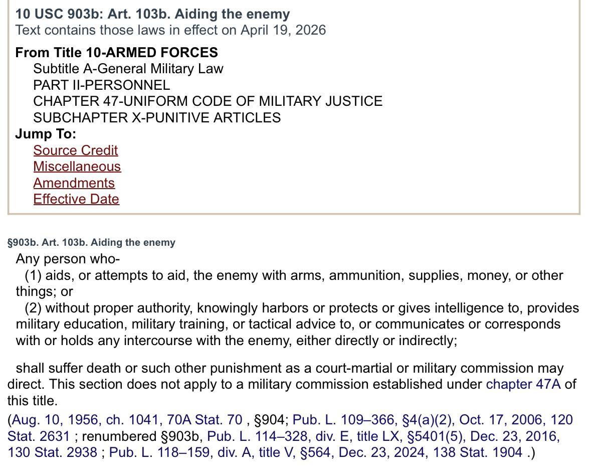 Fornecer armas de destruição em massa a um regime terrorista islâmico radical, enquanto os EUA ainda estão tecnicamente em estado de guerra desde o 11 de setembro… isso é uma ameaça direta à segurança nacional e um ato de guerra contra os Estados Unidos. (Veja abaixo, 10 USC Seção 903b. Artigo 103b.)