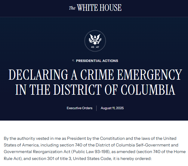 Today, President Trump invoked Section 740 of the D.C. Home Rule Act, seizing control of the Metropolitan Police Department, deploying the National Guard, and vowing to “liberate” Washington, D.C.