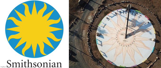 A insígnia do Smithsonian é literalmente um sol maçônico. Este mesmo desenho de sol também foi encontrado na ilha de Epstein na forma de um enorme relógio de sol. Talvez apenas uma coincidência, mas mesmo assim assustador.
