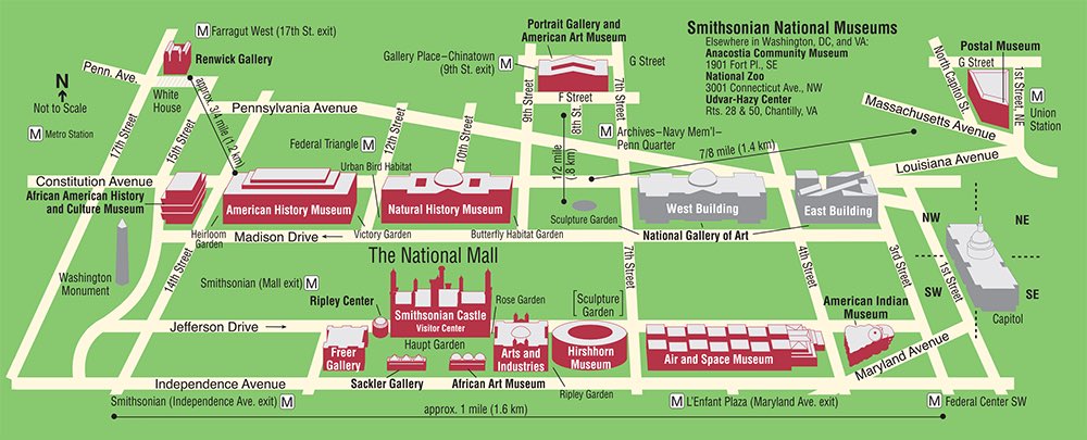Os edifícios se conectam por túneis. Os Museus Smithsonian têm um infame sistema de túneis subterrâneos conectando uma vasta rede de museus sob o National Mall.