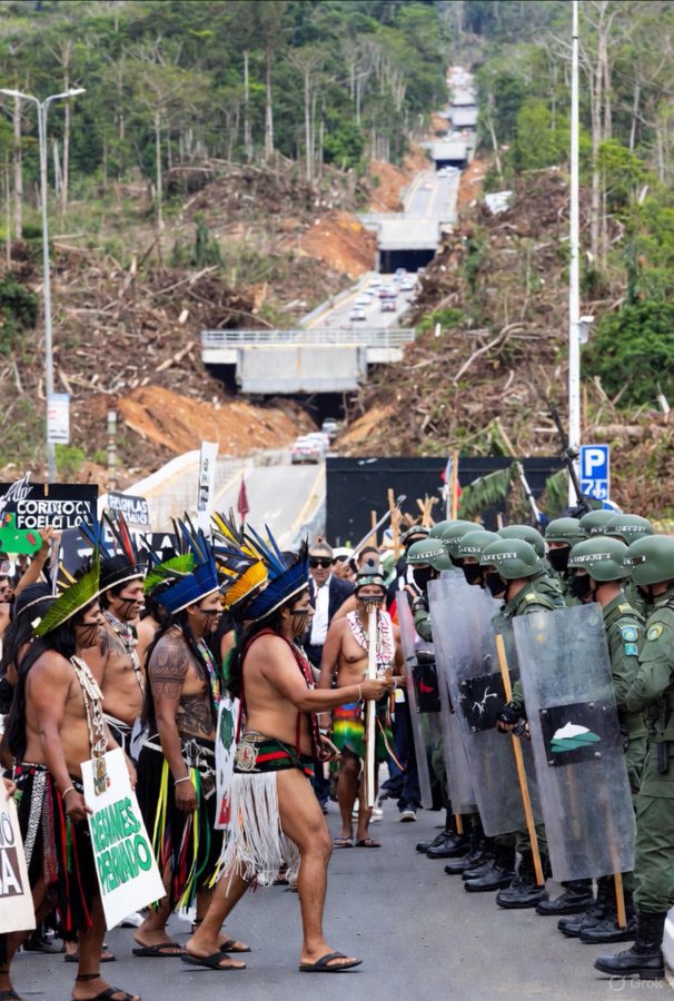 A nova estrada que o ilegítimo governo Lula mandou construir sob aplausos dos burocratas da ONU, cortando a floresta amazônica para que os falsos ambientalistas de esquerda cheguem de carro a CO30 em Belém, destruiu mais de 100.000 árvores e os habitats dos animais foram arruinados. Mas as elites voaram para a COP30 em seus jatos particulares altamente poluentes.