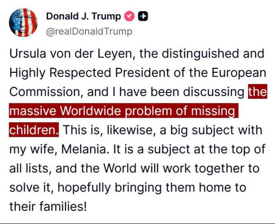 Agora, o Presidente dos Estados Unidos disse isso abertamente. Em um encontro com Ursula von der Leyen, Trump falou diretamente sobre o “enorme problema mundial de crianças desaparecidas”. A verdade finalmente ganhou voz no mais alto cargo da Terra.