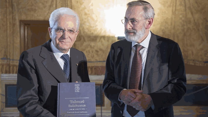 O maçom Sérgio Mattarella, Presidente da República Italiana, mostra o Talmud traduzido para o italiano junto com o Rabino Di Segni.