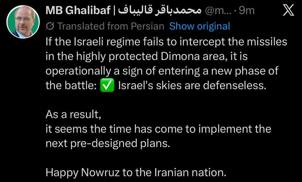 “Se o regime israelense falhou em interceptar os mísseis na área altamente protegida de Dimona, operacionalmente é um sinal de entrada em uma nova fase da batalha: os céus de Israel estão indefesos. Como resultado, parece que chegou a hora de implementar os próximos planos pré-desenhados.”