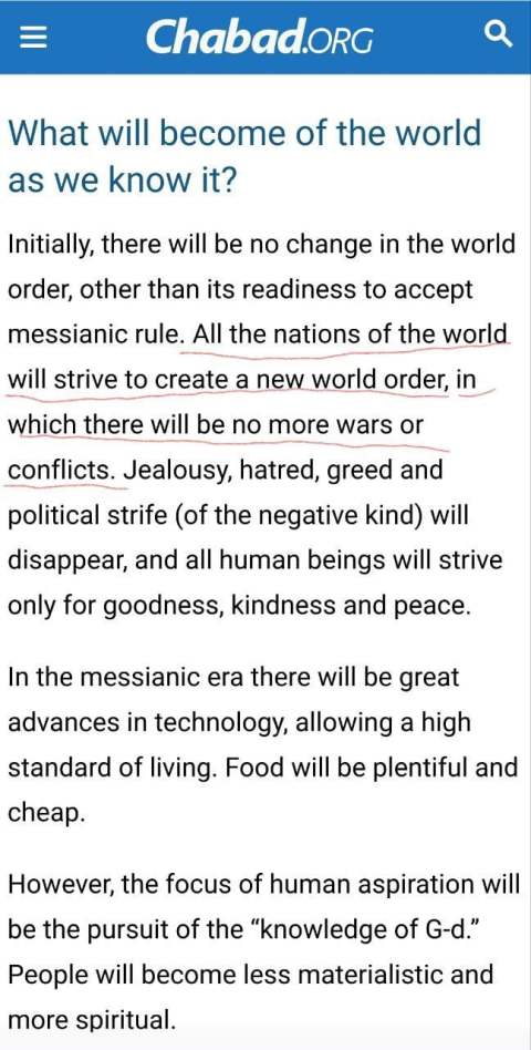 A seção do Chabad que declara que o objetivo final da organização é a Nova Ordem Mundial.
