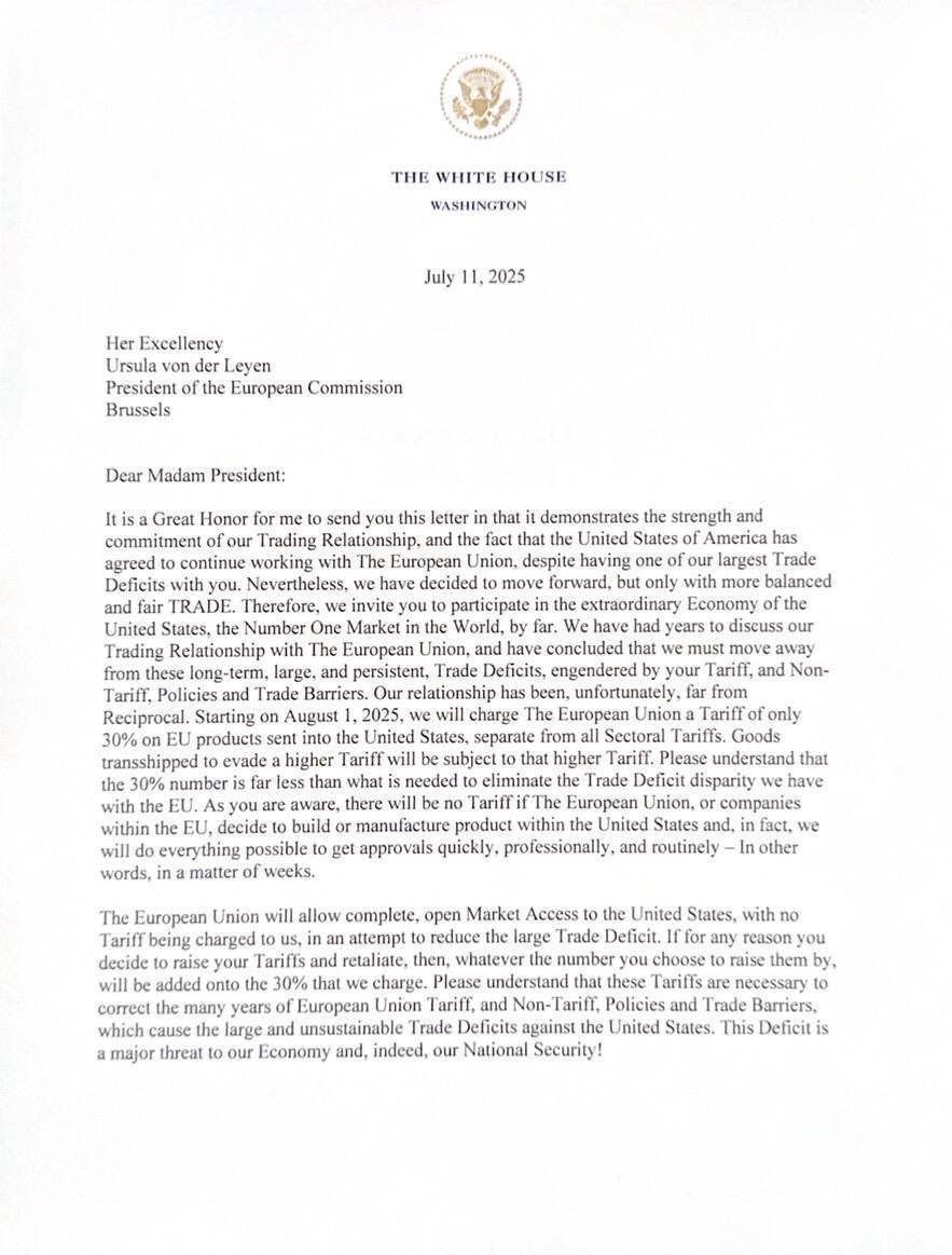 O governo americano impôs tarifas de 30% à ditadura da União “socialista” Europeia, como fez com a China. Este é um golpe devastador para a frágil UE, que se baseia, ou se baseava, nas exportações em detrimento da demanda interna. Donald Trump está dando o empurrão decisivo para derrubar os nazistas de Bruxelas. O futuro da Europa está nas mãos do Rei do Mundo, Trump. Esse é o documento que irá derrubar os fantoches do Deep State na Europa.