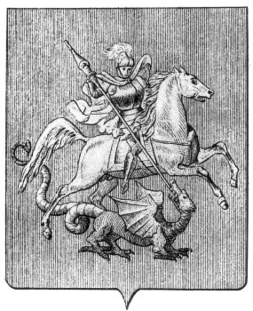 Um cavaleiro do Sacro Império Romano-Germânico matando o grifo da Tartária com uma lança, no brasão de armas de Moscou, 1770.