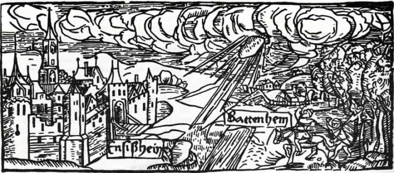 A imagem abaixo é de uma xilogravura feita em 1566 pelo artista Hans Glaser para um jornal da época, que descreve um avistamento real de OVNIs ocorrido na cidade de Nuremberg, Alemanha, cinco anos antes, na hora do nascer do sol, em 14 de abril de 1561. Esta representação está preservada na coleção Wickiana, na Biblioteca Central de Zurique.