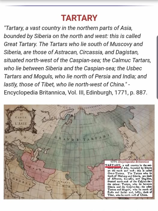 A Enciclopédia Britânica, publicada em Edimburgo em 1771, afirma: “Tartária, um vasto país na parte norte da Ásia, fazendo fronteira com a Sibéria ao norte e oeste: que é chamada de Grande Tartária. Os tártaros que vivem ao sul da Moscóvia e da Sibéria são chamados de Astracã, Cherkassy e Daguestão, que vivem a noroeste do Mar Cáspio; os tártaros calmucos, que vivem entre a Sibéria e o Mar Cáspio; os tártaros uzbeques e os mogóis, que vivem ao norte da Pérsia e da Índia; e, por último, os tibetanos, que vivem a noroeste da China.”