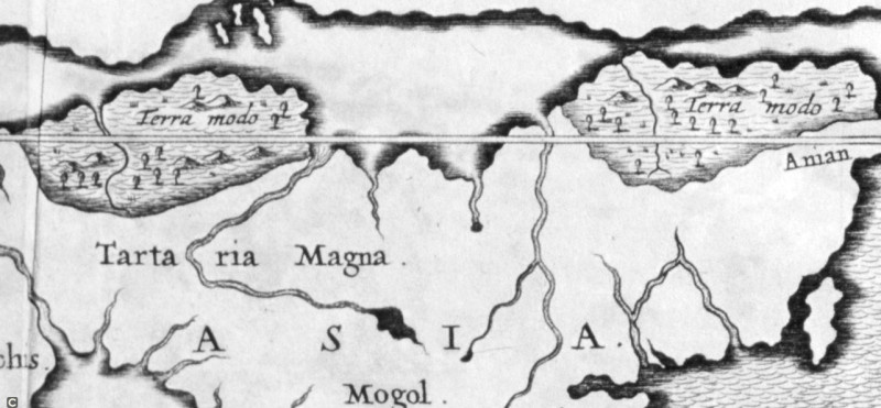 E também tenho uma pequena ideia sobre o mar interior de que fala o autor. Este é um lago Cathay muito grande, que aparece em quase todos os mapas medievais até o século XVII: