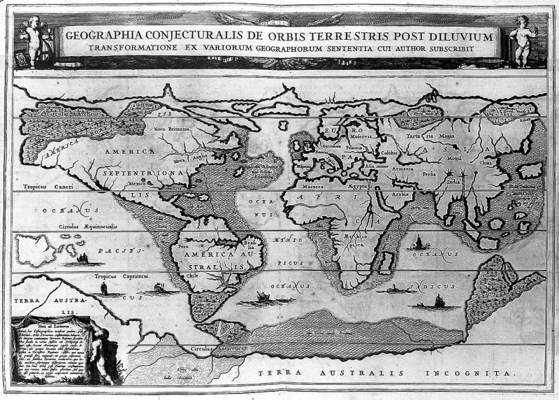 Mapa geográfico do mundo após o dilúvio» de Athanasius Kircher de 1675
