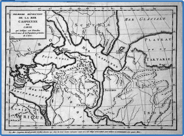 Aqui está este mapa do século 18 escrito por Delisle de Salle. O mapa mostra o Mar Cáspio, com acesso ao Oceano Ártico, ao Mar Negro e ao Golfo Pérsico